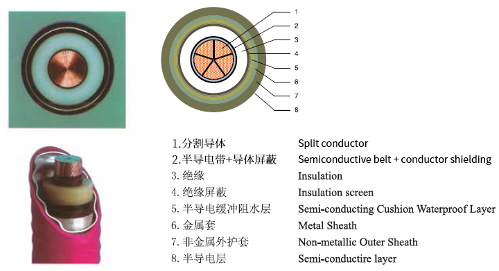 載流量計算假定條件:導體最高工作溫度90℃;短路時最高溫度250℃; 單回路,相間距為電纜直徑+70mm; 環境溫度為+35℃; 直埋土壤熱阻1.0k·m/W;埋地深度1000mm; 護套接地方式:單點接地或交叉互聯。 | |||||||||||